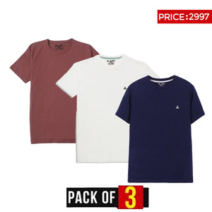1. Maroon t-shirt 2. White t-shirt 3. Navy Blue t-shirt Simplicity meets style in these timeless slim-fit plain cotton tees. A wardrobe staple for everyone! 100% combed cotton.